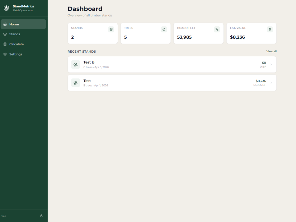 The moment you enter a tree, StandMetrics gets to work. Species, DBH, and height go in fast, and board feet, estimated boards, weight, and market value come back instantly, right there on the screen, before you move to the next tree.